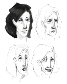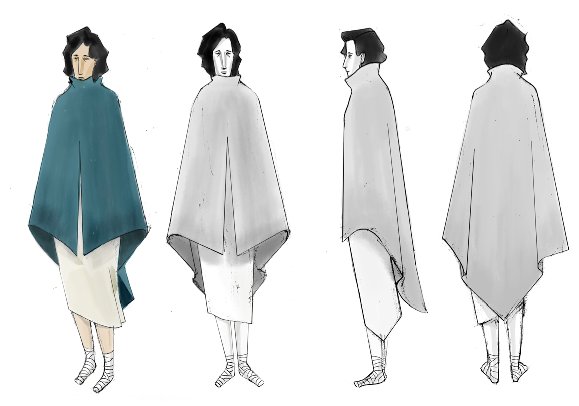 Now that the idea has been set in stone (more or less), the fun part really starts - taking out the paper and pencil and just doodling whatever comes to mind. Maybe that's not entirely accurate, because I already had a strong sense of the kind of "look" I wanted. For example, I knew I wanted the main character (the "Traveller") to be an older woman, the sort of age that communicated that she was probably a mother. I also was fairly set on the fact that she would wear a long sort of robe or cloak, because I knew that the wind would play a major aesthetic role and would provide a lot of interesting opportunities for compositional framing.Click on the images below to expand them.