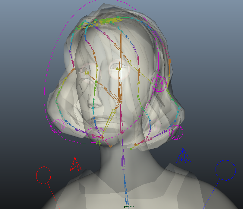 And then: rigging. If you mention "rigging" at any student animation schmooze of ten people, you'll probably get nine groans and one excited smile. The fact is, rigging is a hard-technical process involving math you wished you remembered from high school, and any little number that's off can literally make your model explode. You're essentially making a skeleton with fully rotatable joints, but - just like with modeling - you have to think about how it will have to move, like how lowering the pelvis will cause the knees to bend and the ankles to rotate. It's the sort of thing that would appeal to people like clock makers or automaton builders, and also - weirdly - me. It's probably the same vaguely masochistic side of myself that also enjoyed scouring every inch of my model for non-four-sided polygons. At the same time, I did have to essentially re-rig the whole thing three times. But in the end, I finally had a fully functioning rig complete with a stretchy spine, a scalable god node, IK and FK switches for the arms and legs, autonomous clavicle joints, individual finger controls, eye controls, and a facial expression system combining blendshape controls and soft-selection vertex clusters for nuanced facial expressions. On top of that, I also rigged the hair - each "strand" having its own chain of joints controlled by an IK spline.