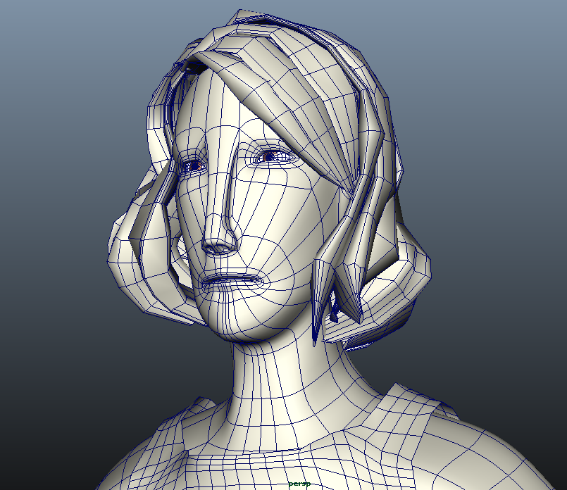 Probably the most challenging thing to model, though, was the hair. I went through countless iterations trying to come up with a way to make it so that I could animate it convincingly, without it becoming a horrendous mass of interpenetrating polygons. I couldn't use a static shape for the hair because wind would be playing such a major part - having the cloak blowing around without the hair also moving would look odd. My solution was to make several thick, distinct "strands" to cover the head, which I could form volume from while keeping the poly count fairly low.