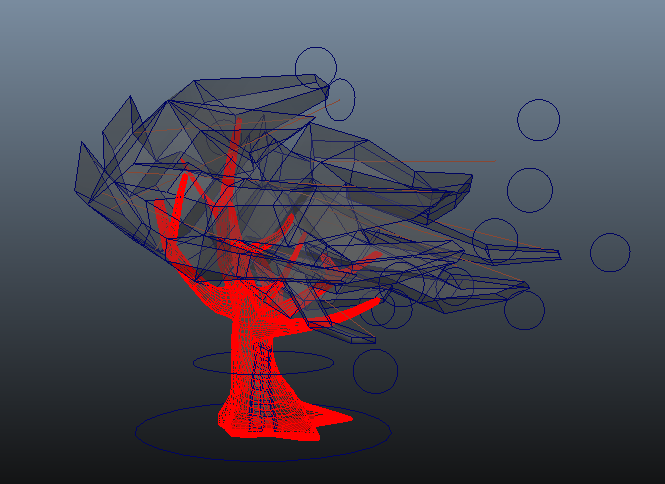 The other "main character" I had to worry about, of course, was the tree. For most of the time it appears, it's actually a figment of the Traveller's imagination; so I wanted it to have a sort of ethereal design, a lot like the burning bush in Dreamworks' "Prince of Egypt". I didn't want this to be the most realistic tree out there; I was more interested in giving an idea of how it moved, and the kind of feeling it could evoke. I was messing around with toon outlines at this point (I'll talk more about this in the next section), and I thought of using actual brush strokes for the foliage. And so this is what ended up happening: I modeled a simple, blocky shape for the foliage's volume, attached a brush outline to the shape, and converted the brush strokes into actual polygons. Then, much like I did with the model's hair, I rigged the foliage with a combination of IK spline joints and soft-selection clusters. This gave me a large amount of control over exactly how I wanted the leaves to move.