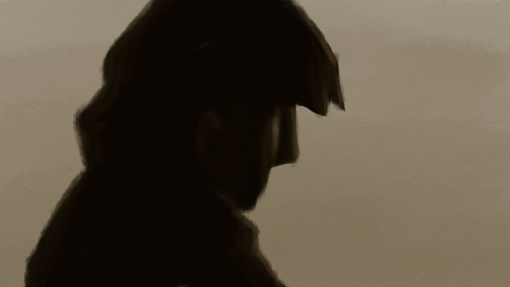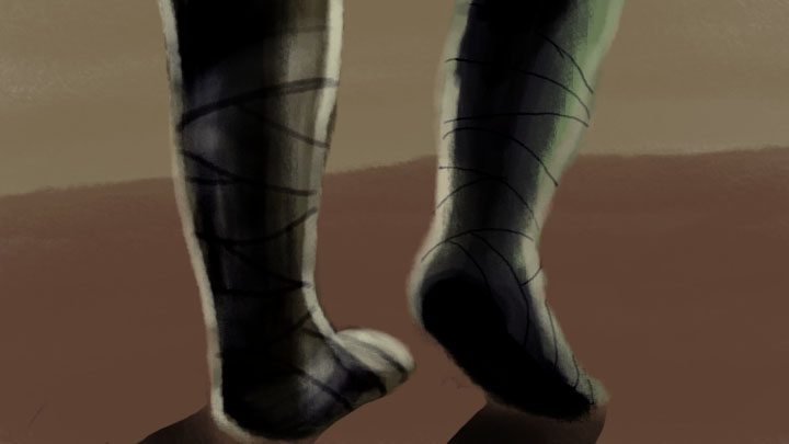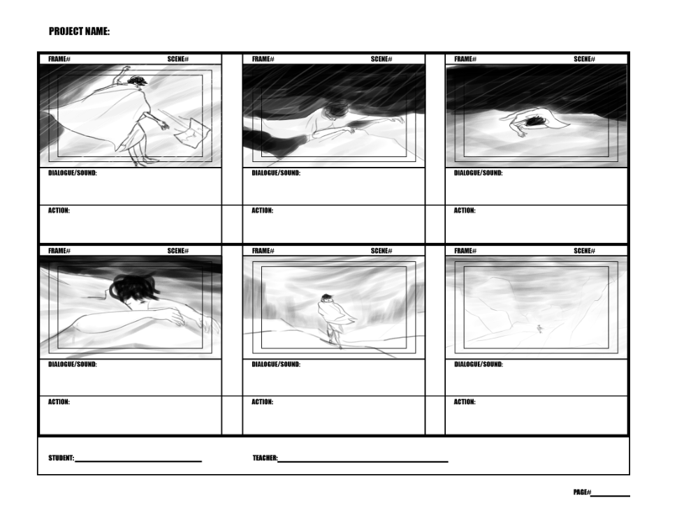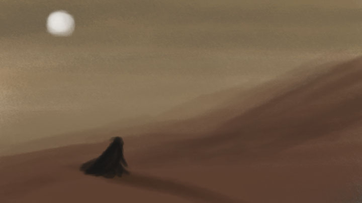 Someone whose name I forget once said, "There are many ways to tell a story, but only one of them is the right way." Storyboarding was tricky for me because there were so many ways to interpret the same scene, and the story I initially had got pared down more and more until it became a very straightforward, very simple concept: a woman is travelling in a desert, she falls, she gets back up, and then she reaches her destination. There's still a place in my mind for the full blown, ten minute version of this story, but what I'm making here is sort of like the parable version of it.What's interesting, though, is that there were several shots that I specifically knew I had to have, and they remained persistent throughout all the different storyboard iterations I made. The way the main title appears has always been basically the same, as well as the shots of the Traveller falling, getting back up, and finally climbing over a ledge to see the tree in the end.