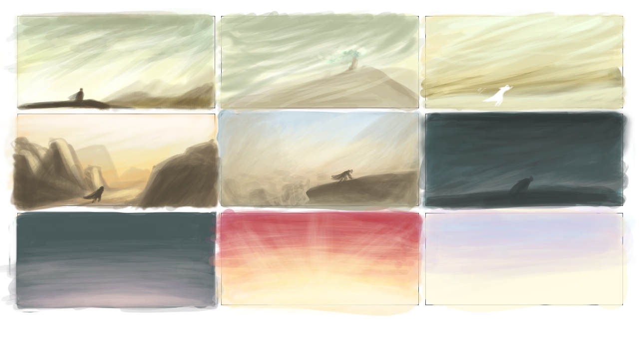 I also stole the idea of "color scripts" from Pixar: that is, a set of the different uses of color I'd use at key points in the story.
